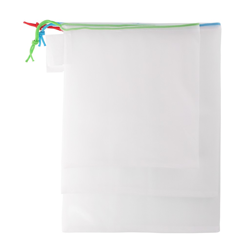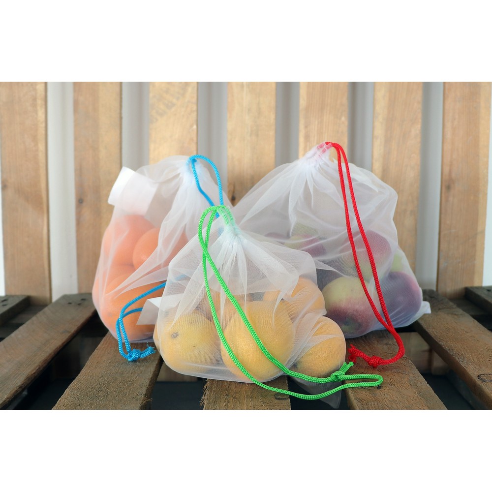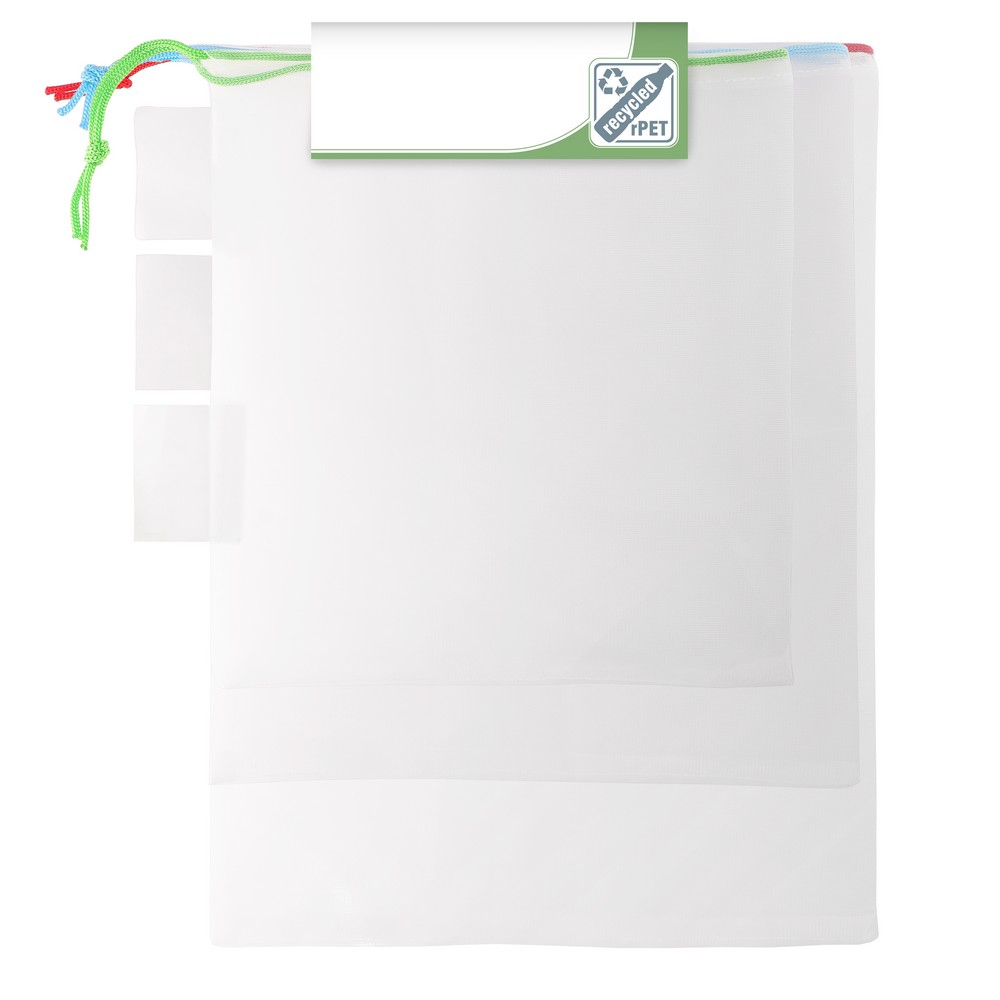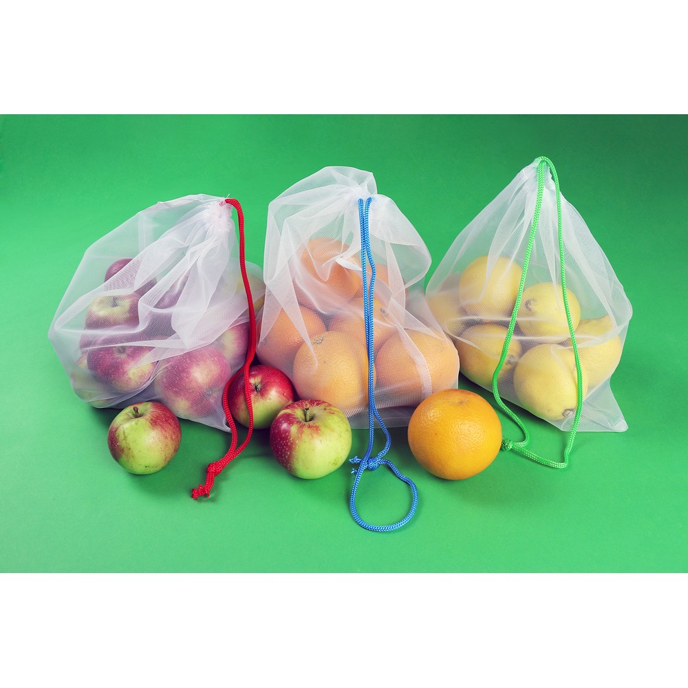 Description : Set de 3 sacs en RPET pour fruits et légumes de différentes tailles : 26 x 28 cm, 30 x 33 cm, 30 x 40 cm, chaque sac avec étiquette spéciale pour l'impression