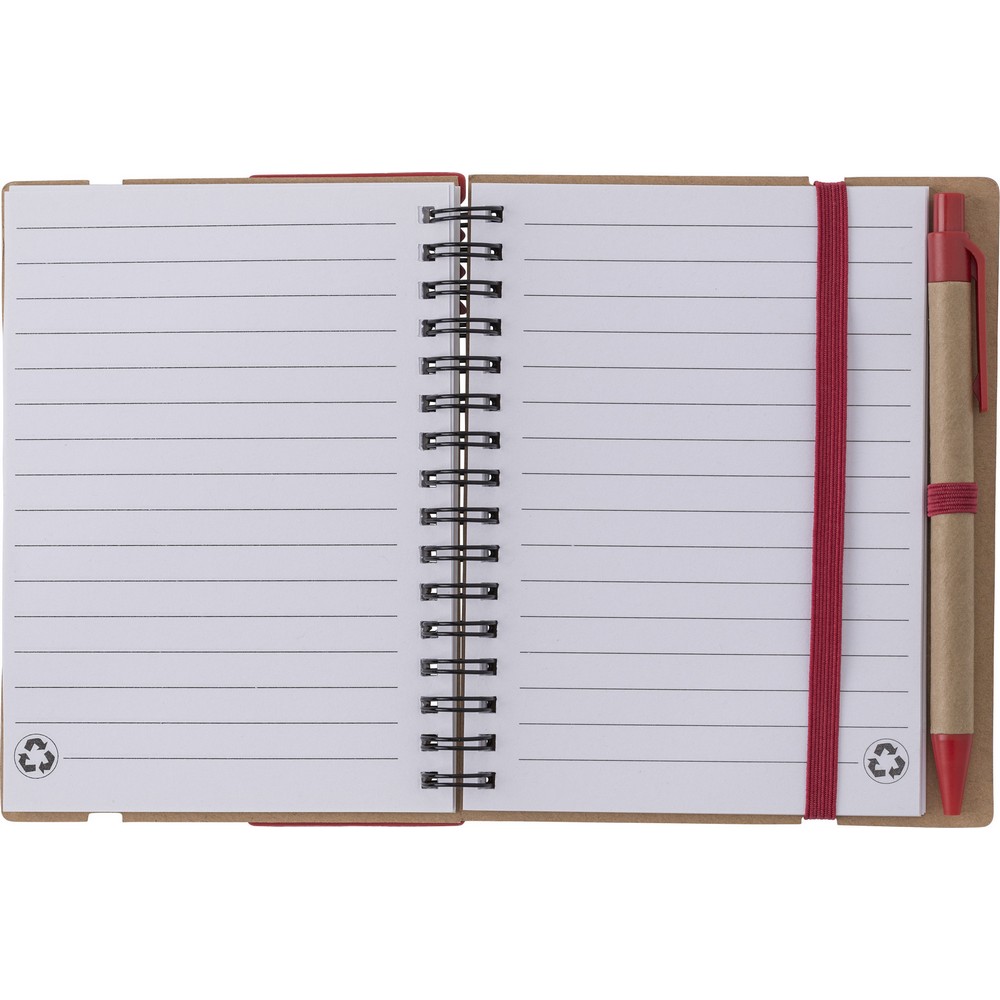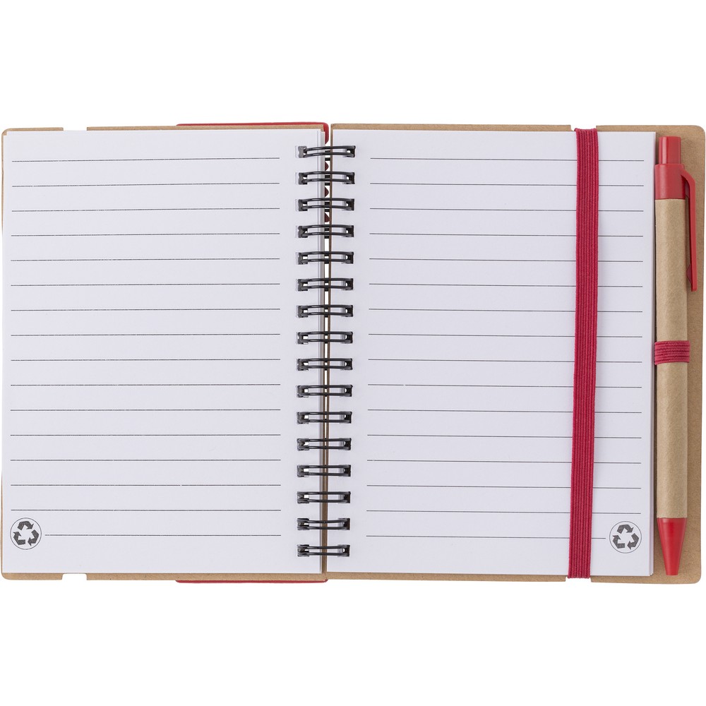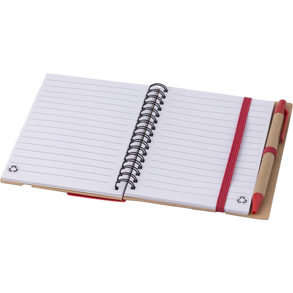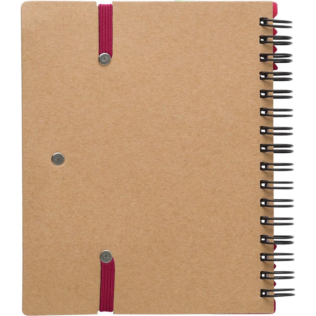 Description : Marque-pages, cahier (60 feuilles de papier ligné recyclé), stylo bille, règle, 125 notes autocollantes (25 pièces par couleur), reliure à spirale