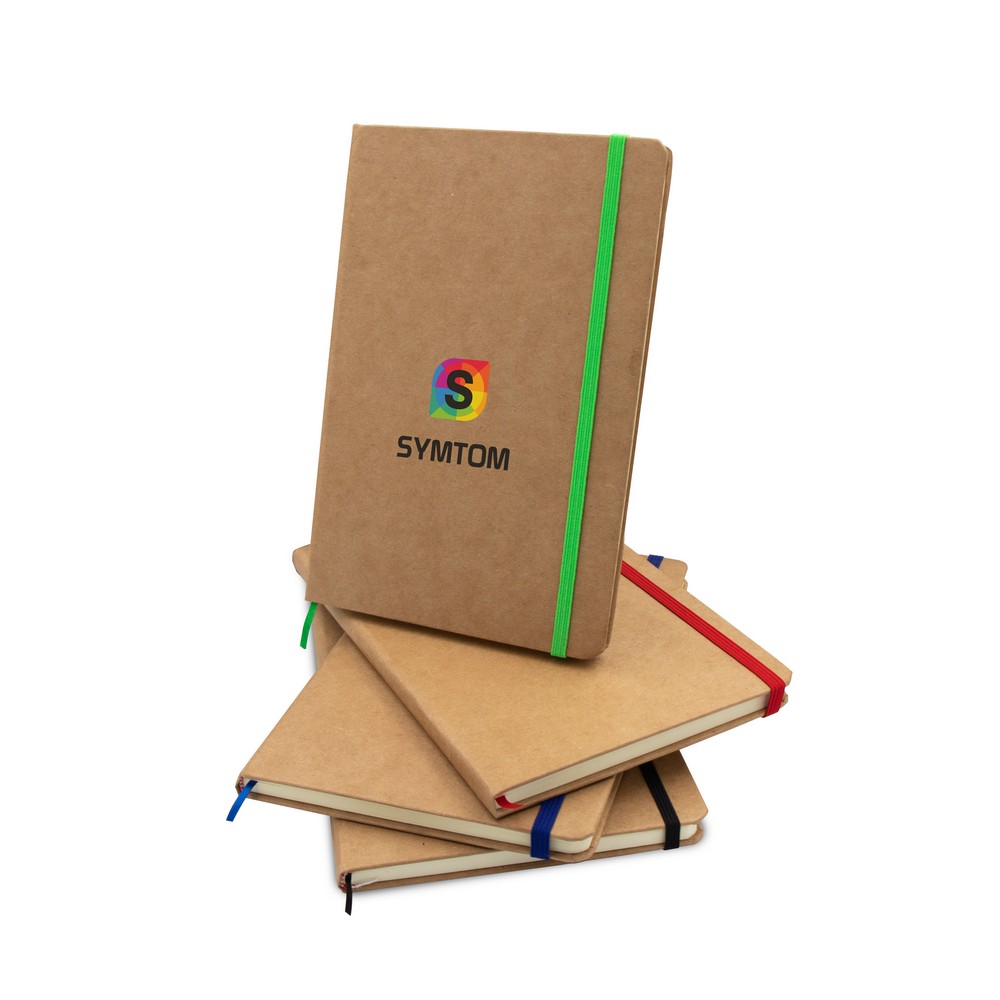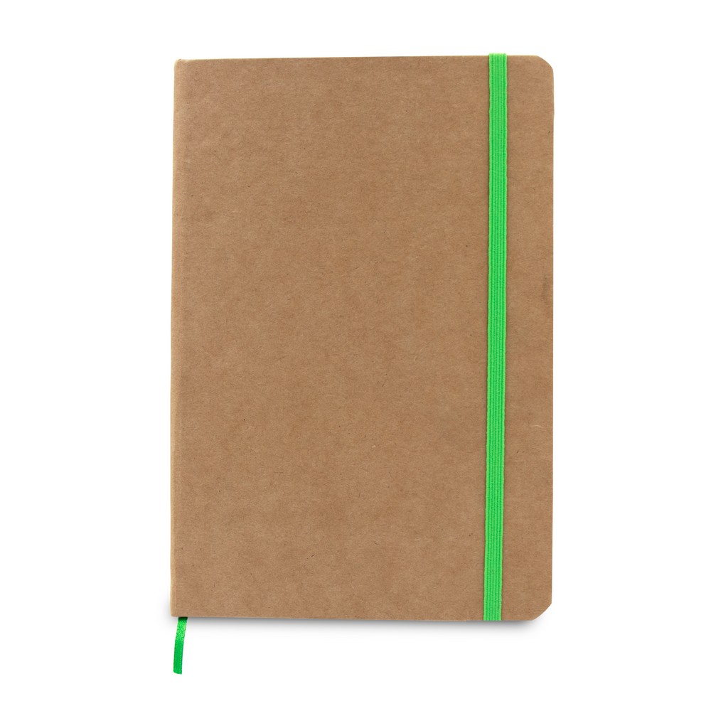 Description : Cahier (env. A5, 96 feuilles doublées, couleur crème 70 g/m2), en papier recyclé, couverture rigide, ruban marqueur et bande élastique pour la fermeture