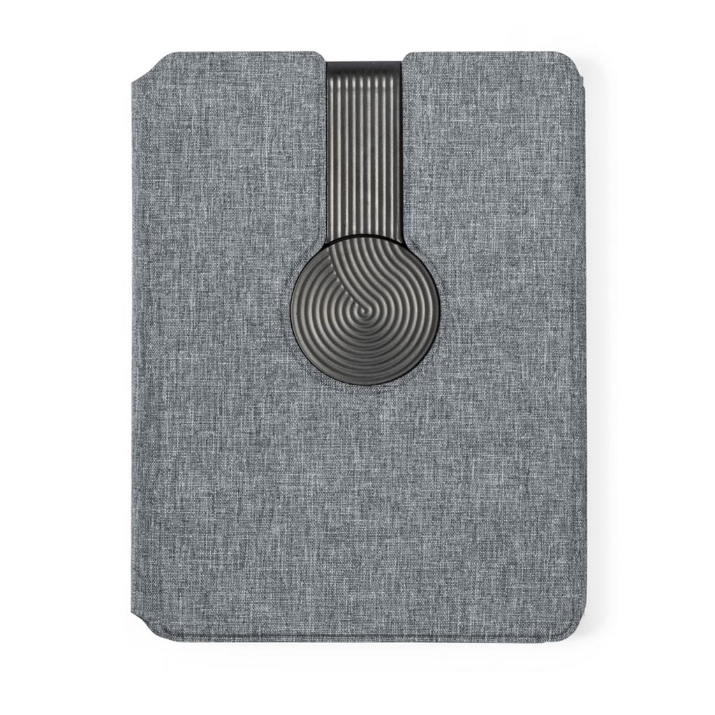 Description : Carnet multifonctionnel A5 (65 feuilles lignées), en RPET, fermeture magnétique, chargeur magnétique sans fil 10W, fonctionne avec les téléphones portables avec fonction de charge inductive, alignement magnétique adapté uniquement aux appareils compatibles, anneau métallique adhésif inclus, Power Bank 5000 mAh, diodes de signalisation niveau de puissance, entrée/sortie USB type C 5-9V/2.1-3A, support pour téléphone, compartiments pour cartes, câble inclus