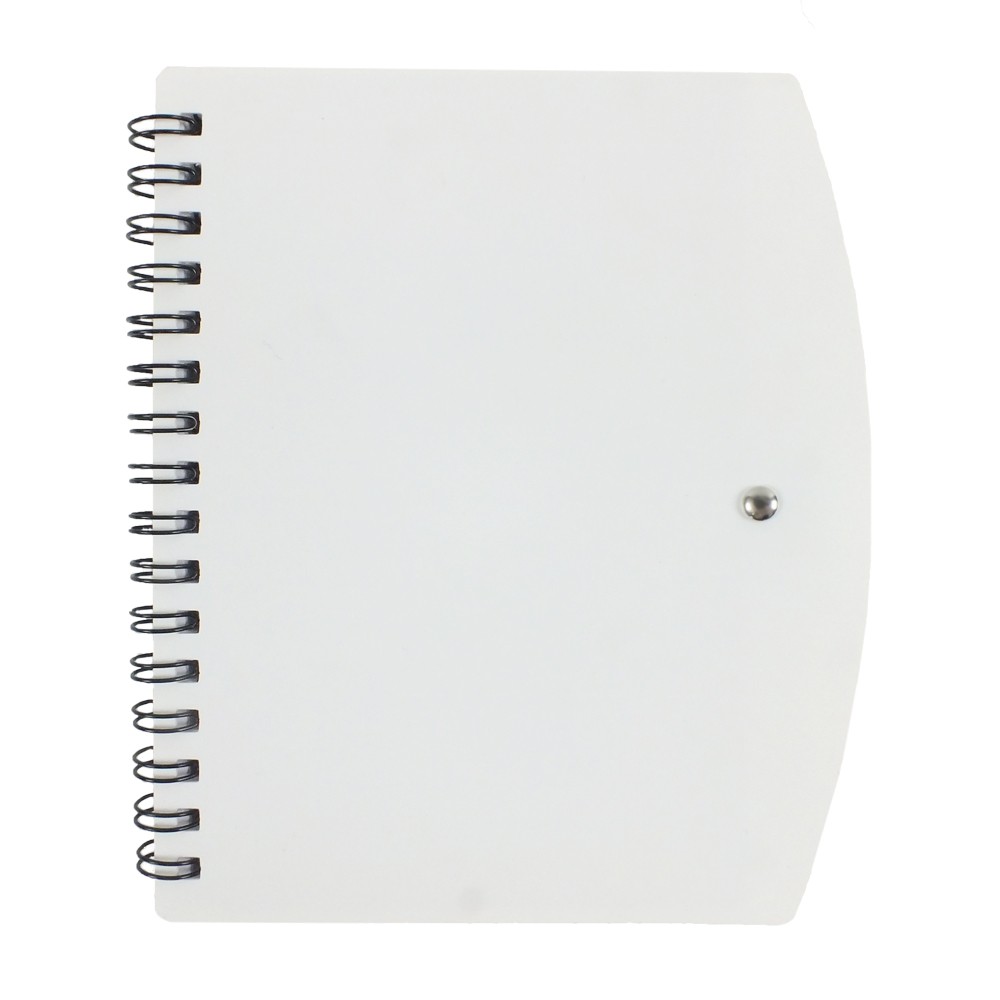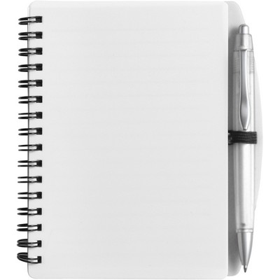 Description : Carnet à spirale en PP souple format A6 contenant 70 feuillets de 70g, livré avec un stylo bille en plastique, mine bleue